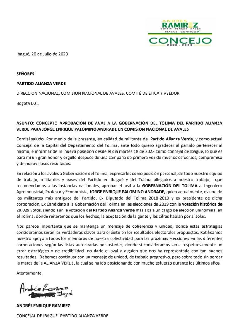 Este 20 de julio el Concejal Andrés Ramírez del partido Alianza Verde expresó su apoyo a la Candidatura de Jorge Enrique Palomino a la Gobernación del Tolima.