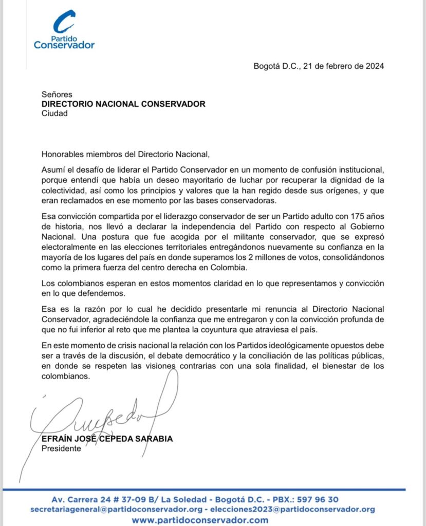 Crisis en el partido Conservador, en medio de la controversia por el eventual arribo de Luz Cristina López Trejos al Ministerio de Deporte –considerada ficha de algunos miembros de la bancada conservadora–, se conoció la renuncia del presidente del Partido Conservador, Efraín Cepeda.