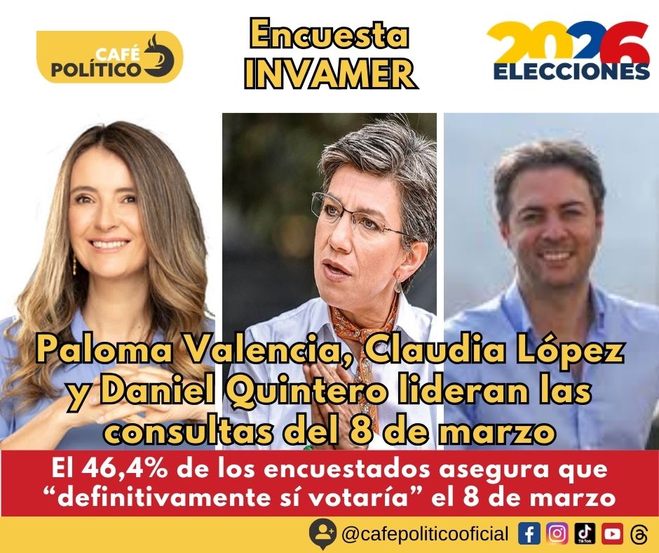 La última medición de Invamer, a diez días de las consultas interpartidistas, muestra a Paloma Valencia, Claudia López y Daniel Quintero como favoritos en sus bloques, mientras Iván Cepeda mantiene la ventaja en la carrera general a la Presidencia.