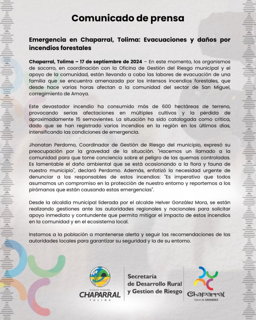 Desde ayer martes 18 de septiembre, un incendio forestal en la vereda San Miguel de Chaparral ha ocasionado pérdidas ambientales significativas, afectando más de 700 hectáreas de vegetación y cultivos. A las 3 de la mañana, los organismos de socorro, junto con la comunidad, continuaban trabajando arduamente para mitigar las llamas que amenazan la biodiversidad y los recursos de la región.